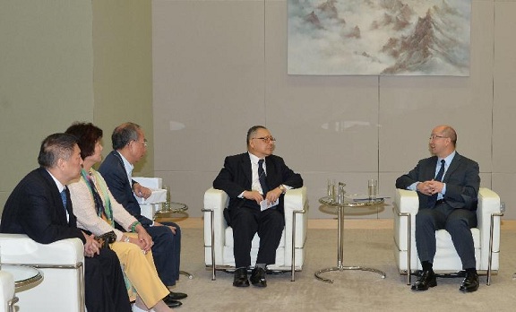 政制及內地事務局局長與香港僑界社團聯會就政制發展會面(一) 政制及內地事務局局長譚志源(右)今日(四月三十日)上午與香港僑界社團聯會會面,就《二零一七年行政長官及二零一六年立法會產生辦法諮詢文件》和與會者交流。