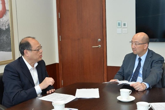 政制及內地事務局局長與立法會議員林大輝就政制發展會面(一) 政制及內地事務局局長譚志源(右)今日(四月三十日)與立法會議員林大輝會面,就《二零一七年行政長官及二零一六年立法會產生辦法諮詢文件》交流。
