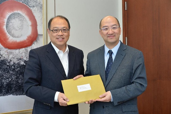政制及內地事務局局長與立法會議員林大輝就政制發展會面(二) 譚志源(右)接收林大輝就政制發展的意見書。 |