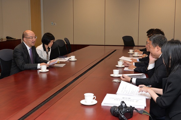 政制及內地事務局局長與香港青年工業家協會就政制發展會面(一) 政制及內地事務局局長譚志源(左)今日(五月二日)下午與香港青年工業家協會會面,就《二零一七年行政長官及二零一六年立法會產生辦法諮詢文件》和與會者交流。