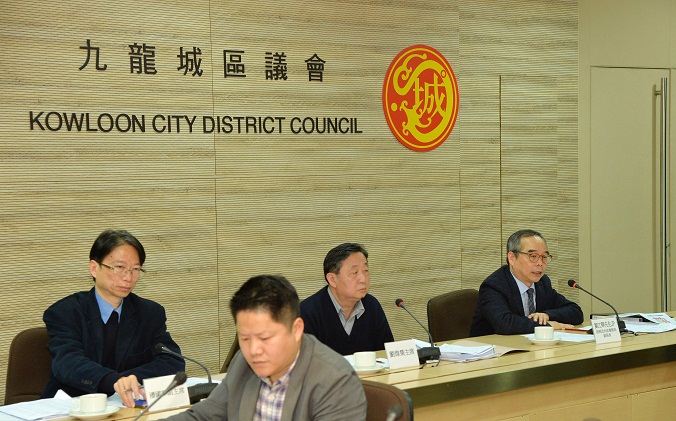 政制及內地事務局副局長劉江華(右一)今日(二月十二日)下午在九龍城區議會會議上,向議員講解《行政長官普選辦法諮詢文件》和聽取他們的意見。