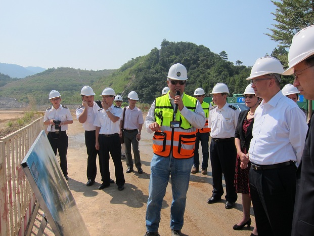 政制及內地事務局局長譚志源今日(十月二十三日)訪問廣州市,了解當地的最新發展和穗港兩地不同方面的合作。圖示譚志源(右二)參觀香港賽馬會從化馬匹訓練中心,聽取工作人員介紹中心的規劃和工程進展。