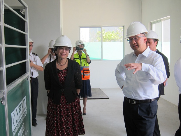 譚志源(右)在廣東省港澳事務辦公室副主任葉維園(左)的陪同下,參觀香港賽馬會從化馬匹訓練中心的臨時馬廐。