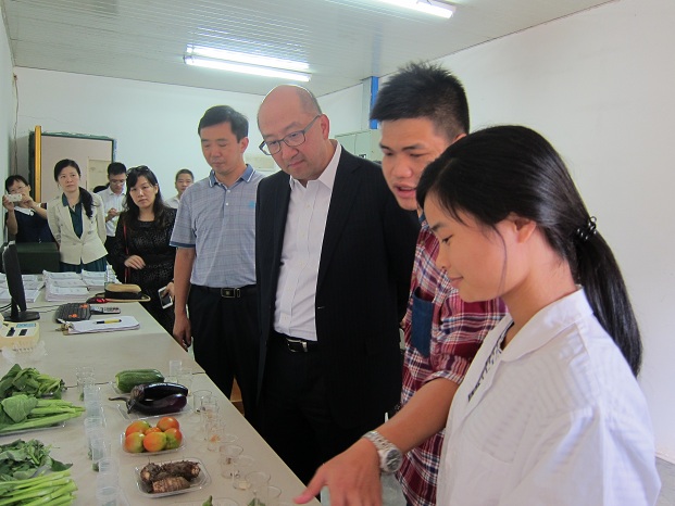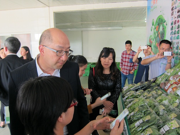 譚志源(左)參觀從化一個註冊供港蔬菜種植基地,聽取員工介紹如何利用電子平台銷售農產品。