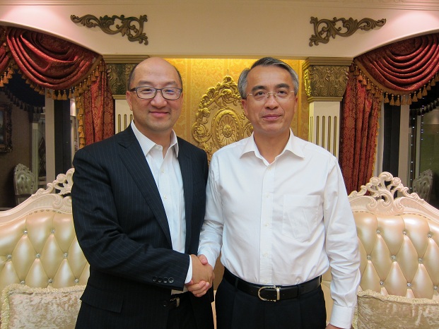 譚志源(左)在廣州與廣州市副市長蔡朝林會面,就兩地的合作事宜交換意見。 |