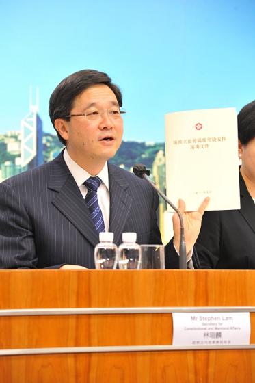 政制及內地事務局局長林瑞麟今日(七月二十二日)舉行記者會發表《填補立法會議席空缺安排諮詢文件》,並進行為期兩個月的公眾諮詢。圖示林瑞麟於記者會上展示公眾諮詢文件。