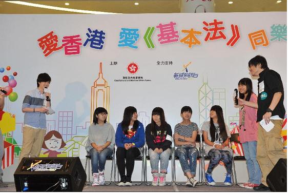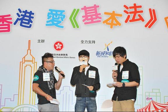 政制及內地事務局今日(九月二十五日)下午於荃灣廣場舉辦「愛香港.愛《基本法》同樂日」,節目內容資訊與娛樂並重。圖示歌手方大同以輕鬆手法介紹《基本法》內容。