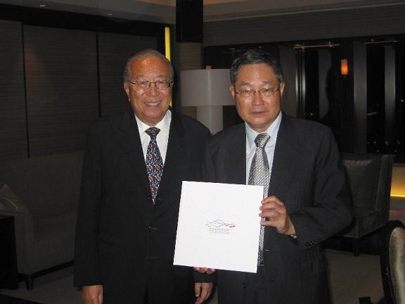 「協進會」主席李業廣(左)致送紀念品予「策進會」董事長林振國。