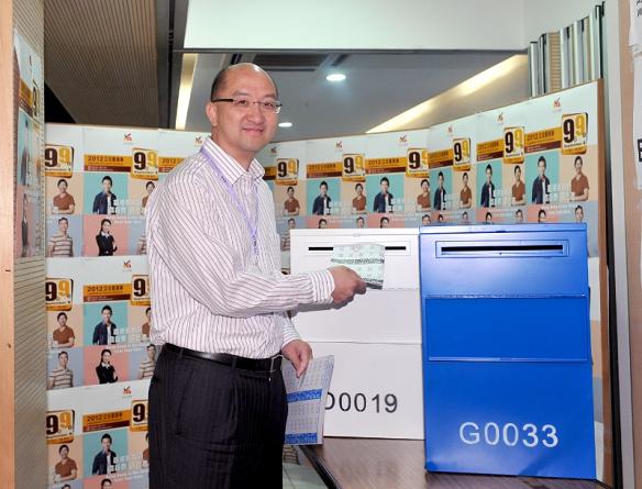 政制及內地事務局局長譚志源今日(九月九日)早上在柏道聖士提反女子中學附屬小學投票站為二○一二年立法會選舉區議會(第二)功能界別投票。