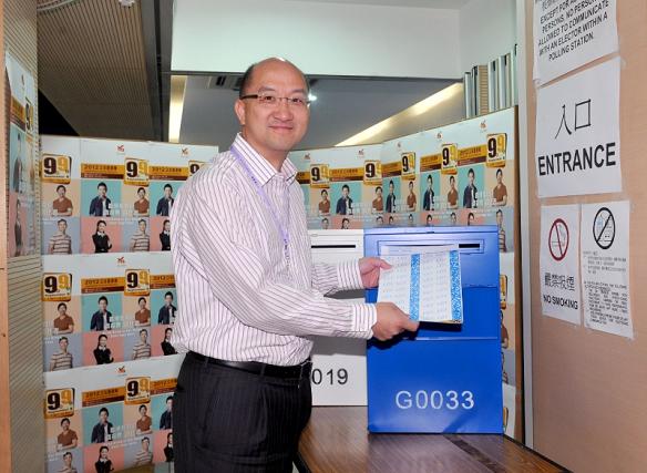 各位選民,今日到達投票站後,只要你出示身份證,票站的職員便會向你提供兩張選票,一張是藍色邊、藍色背景的地區直選選票;另一張是較為細小,白色邊、白色背景的「超級區議會」的選票。大家記得,每一票蓋上一個印便可以。今日我留意到天氣是不錯的,我在此再一次呼籲全港合資格的三百四十多萬名選民能夠在今天早上七時三十分至今天晚上十時三十分抽點時間到所屬的投票站來投票,行使你在《基本法》下的投票權。