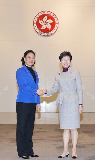 政務司司長林鄭月娥和廣東省副省長招玉芳今日(三月十日)上午在添馬政府總部共同主持粵港合作聯席會議第十九次工作會議。圖示林鄭月娥(右)與招玉芳(左)握手問好。