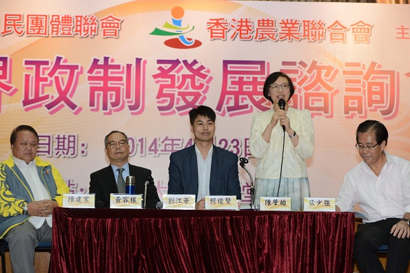 署理食物及衛生局局長陳肇始教授(右二)和政制及內地事務局副局長劉江華(左二)今日(四月二十三日)下午出席由香港漁民團體聯會及香港農業聯合會主辦的政制發展諮詢會,就《二零一七年行政長官及二零一六年立法會產生辦法諮詢文件》和與會者交流。