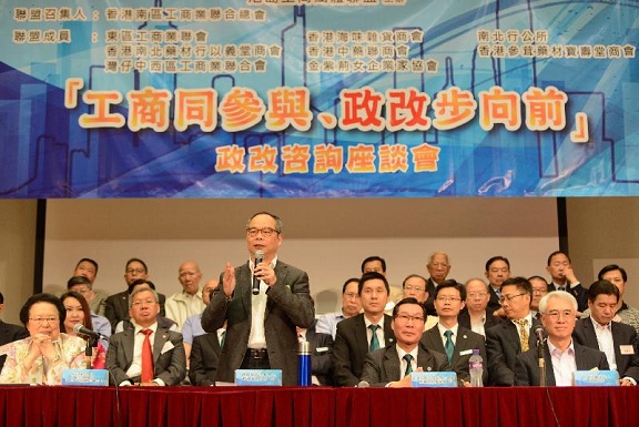 政制及內地事務局副局長劉江華(前排左二)今晚(四月二十八日)出席由港島工商團體聯盟舉辦的「工商同參與、政改步向前」政改諮詢座談會,就《二零一七年行政長官及二零一六年立法會產生辦法諮詢文件》和與會者交流。