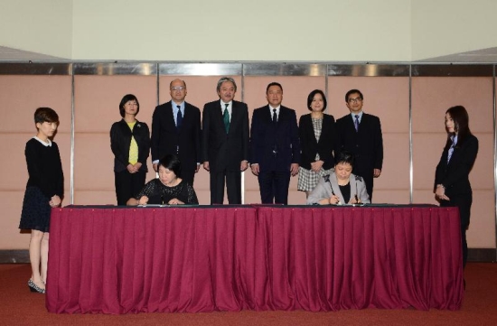(後排左起)政制及內地事務局常任秘書長張琼瑤、政制及內地事務局局長譚志源、財政司司長曾俊華、澳門特別行政區經濟財政司司長梁維特、澳門特別行政區經濟財政司司長辦公室主任陸潔嬋、澳門特別行政區行政長官辦公室顧問高展鴻今日(七月十五日)在澳門一同見證《香港特別行政區與澳門特別行政區關於建立更緊密經貿關係的安排》主體文本的草簽儀式。前排為香港工業貿易署副署長蘇婉玲(左)及澳門經濟局代局長陳子慧(右)。