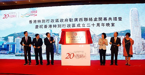 其他出席今日聯絡處開幕典禮暨慶祝香港特別行政區成立二十周年晚宴的主禮嘉賓包括廣西壯族自治區黨委書記彭清華、廣西壯族自治區黨委常委及秘書長王可、廣西壯族自治區人民政府副主席張曉欽、特區政府駐粵經濟貿易辦事處主任鄧家禧及特區政府駐廣西聯絡處主任盧詠斯。