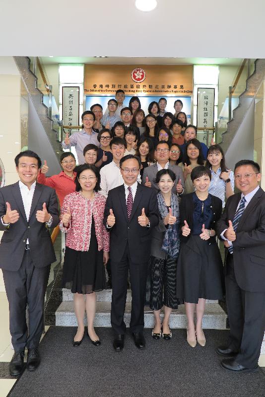政制及內地事務局局長聶德權今日(八月十五日)到訪香港特別行政區政府駐北京辦事處(駐京辦)。圖示聶德權(前排左三)與駐京辦同事合照。