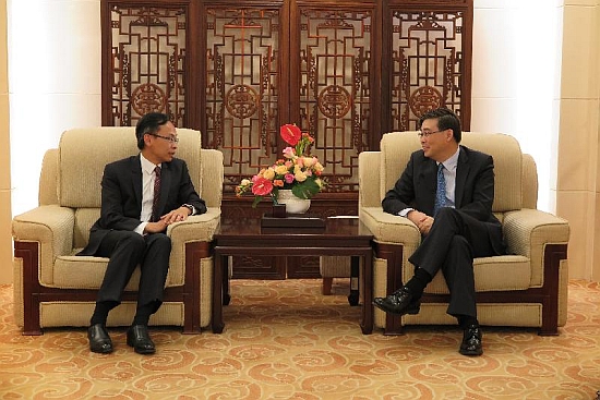 政制及內地事務局局長聶德權(左)今日(八月十五日)在北京與外交部香港澳門台灣事務司司長馮鐵會面。