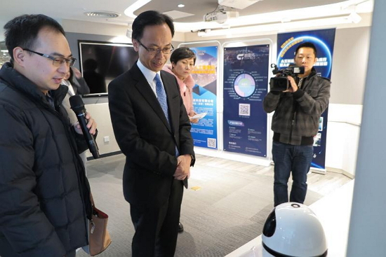 政制及內地事務局局長聶德權今日(一月十一日)到訪佛山粵港澳合作高端服務示範區內的粵港澳科技展示交流中心。圖示聶德權(左二)觀看中心內的智能產品。