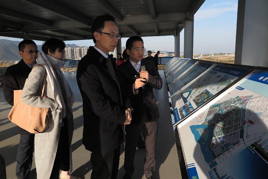 政制及內地事務局局長聶德權(右二)今日(一月十一日)到訪肇慶,在硯陽湖觀景台聽取肇慶官員講解肇慶的最新規劃建設。