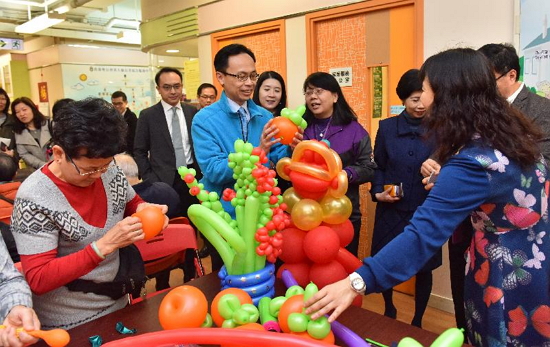 政制及內地事務局局長聶德權今日(一月二十五日)參觀黃大仙香港聖公會黃大仙長者綜合服務中心。圖示中心職員向聶德權(左三)展示長者在扭汽球班的作品。