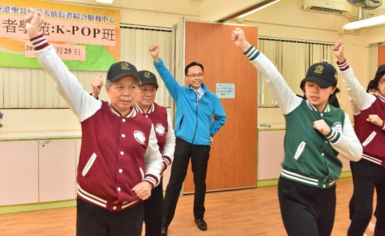 政制及內地事務局局長聶德權今日(一月二十五日)到訪黃大仙香港聖公會黃大仙長者綜合服務中心。圖示聶德權(右三)與參與舞蹈班的長者一起跳舞。