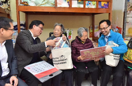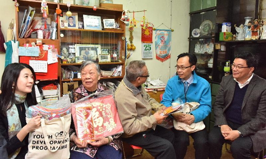 政制及內地事務局局長聶德權(右一)今日(一月二十五日)探訪黃大仙的長者家庭,並向她們送上禮物包。