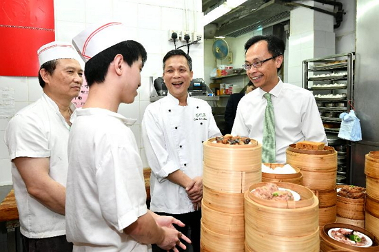政制及內地事務局局長聶德權(右)今日(四月三日)到訪最近採納《消除性傾向歧視僱傭實務守則》的飲食企業,與僱員傾談,了解他們的工作狀況。