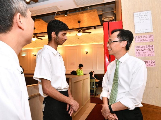 政制及內地事務局局長聶德權(右)今日(四月三日)到訪最近採納《消除性傾向歧視僱傭實務守則》的飲食企業,並與一名少數族裔僱員交談,了解他的工作情況。