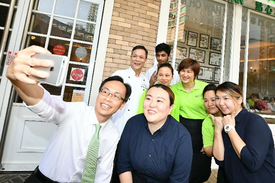 政制及內地事務局局長聶德權今日(四月三日)到訪最近採納《消除性傾向歧視僱傭實務守則》的飲食企業。圖示聶德權(前排左一)與員工合照。