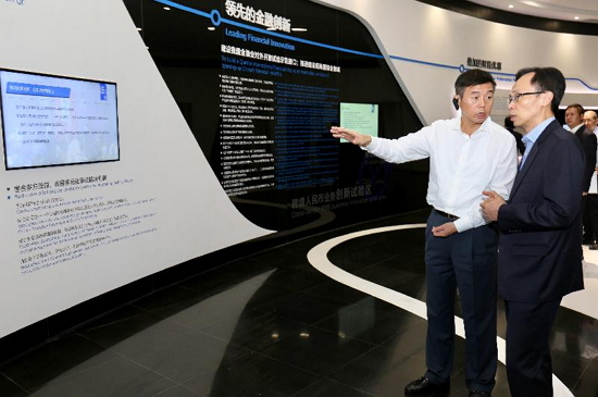 政制及內地事務局局長聶德權今日(八月二十九日)訪問前海。圖示聶德權(右)參觀前海展示廳,並聽取深圳市委常委兼前海蛇口自貿片區管委會主任田夫介紹前海的規劃發展。