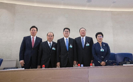 聯合國人權理事會普遍定期審議工作小組今日(日內瓦時間十一月六日)於瑞士日內瓦舉行會議,審議由中國提交的第三次報告,當中涵蓋香港特別行政區和澳門特別行政區的報告。一個由政務司司長張建宗率領的香港特區政府官員團隊,以中國代表團成員身分出席該會議。圖示中國政府代表團合照,左起:中國常駐聯合國日內瓦辦事處和瑞士其他國際組織代表團特命全權大使、常駐代表俞建華(代表團副團長);張建宗(代表團副團長,香港特別行政區);外交部副部長樂玉成(代表團團長);外交部助理部長張軍(代表團副團長);及澳門特別行政區行政法務司司長陳海帆(代表團副團長,澳門特別行政區)。