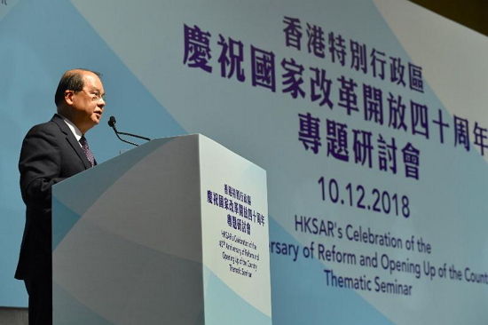 政務司司長張建宗今日(十二月十日)在香港特別行政區慶祝國家改革開放四十周年專題研討會致辭。
