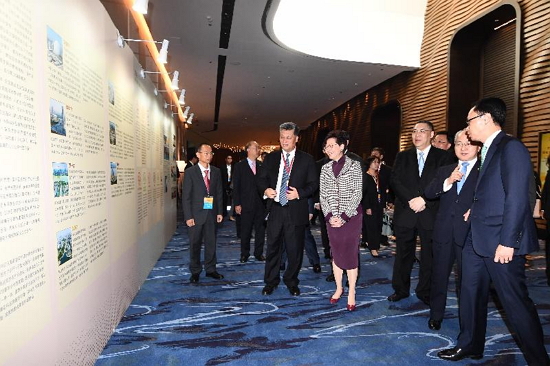 行政長官林鄭月娥今日(二月二十一日)出席《粵港澳大灣區發展規劃綱要》宣講會。圖示林鄭月娥(右四)、廣東省省長馬興瑞(右五)、澳門特別行政區行政長官崔世安(右三)、中央人民政府駐香港特別行政區聯絡辦公室主任王志民(右二)及政制及內地事務局局長聶德權(右一)觀看有關粵港澳大灣區發展的展板。