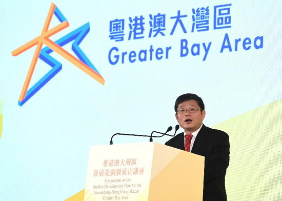 香港特別行政區政府與廣東省人民政府和澳門特別行政區政府今日(二月二十一日)共同舉辦《粵港澳大灣區發展規劃綱要》宣講會。圖示國家發展和改革委員會地區經濟司司長郭蘭峰介紹《粵港澳大灣區發展規劃綱要》內容。